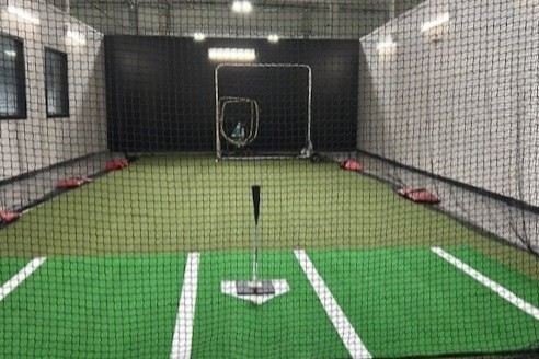Our 28 x 42 yard netted “open” field divided in half. The South half includes two draw curtains that can be closed to create one or two batting tunnels for live baseball/softball hitting.